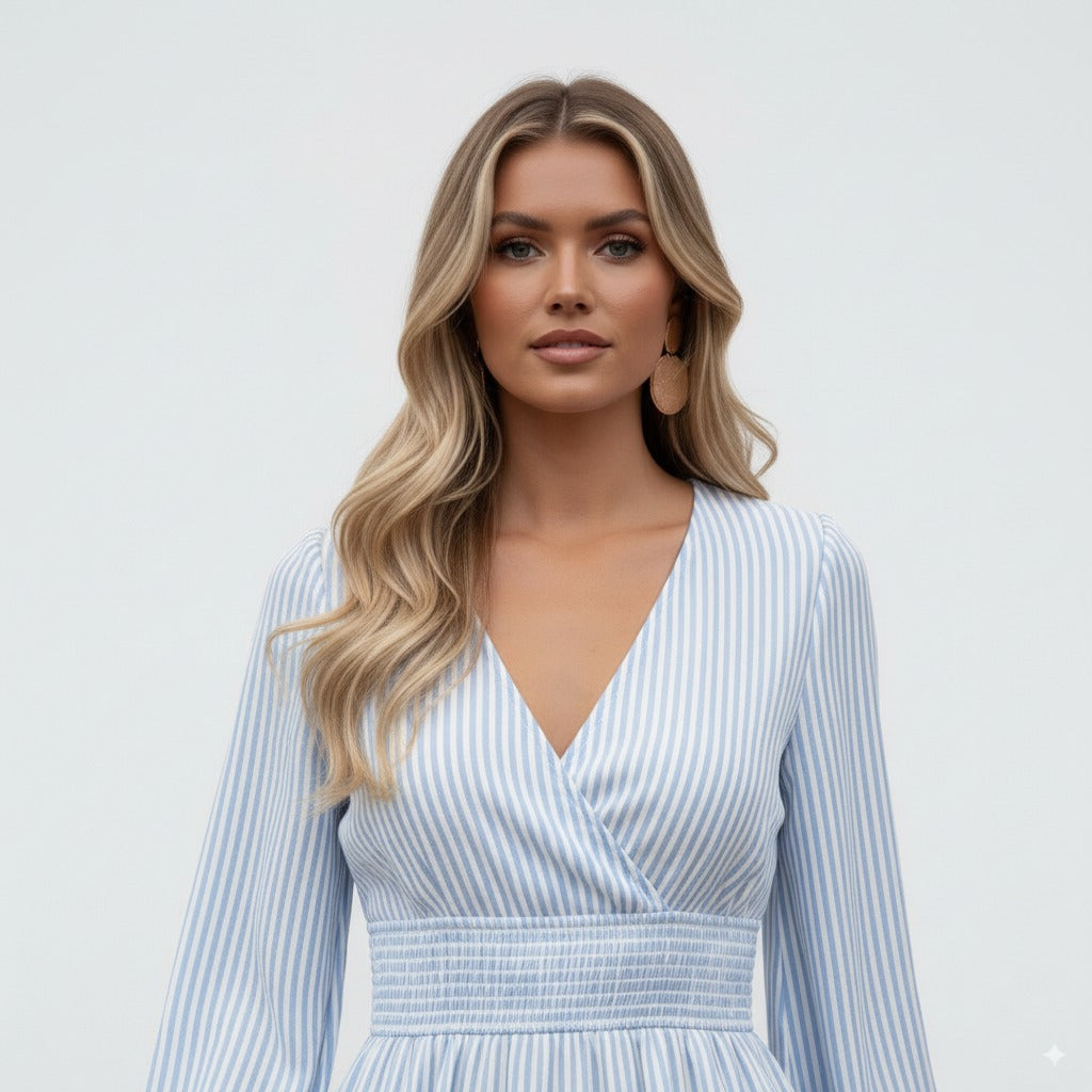 Cette robe blazer pastel se distingue par ses détails raffinés qui font toute la différence. Le col V croisé crée un décolleté élégant qui met en valeur votre silhouette, tandis que les manches longues ajoutent une touche de sophistication. La taille haute marquée par des smocks apporte une définition parfaite à votre silhouette, créant cet effet "sablier" tant recherché. Son tissu orné de motifs jacquard textilé et de détails à volants ajoute une dimension tactile qui rend cette pièce véritablement spéciale.
