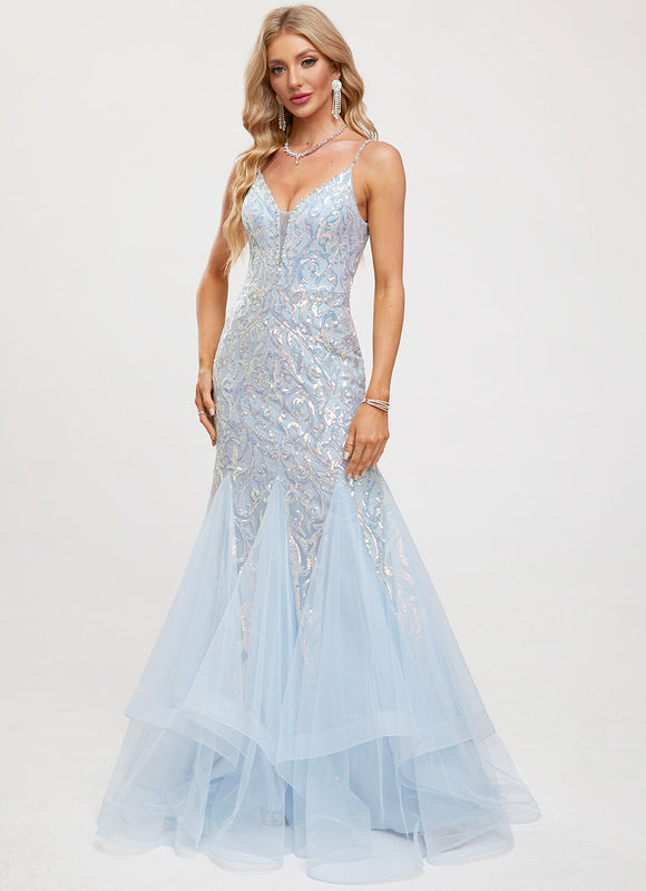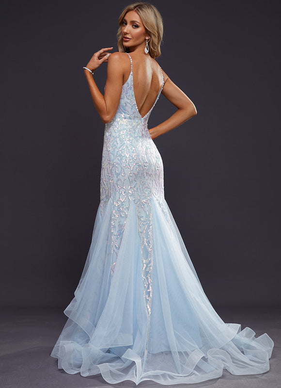 Robe Pastel Bleu Sirène Traîne Pailletée : L'élégance incarnée pour vos soirées de gala