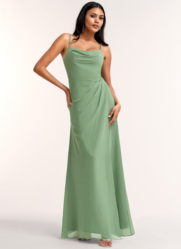 Robe longue vert sauge à col bénitier pour une élégance raffinée
